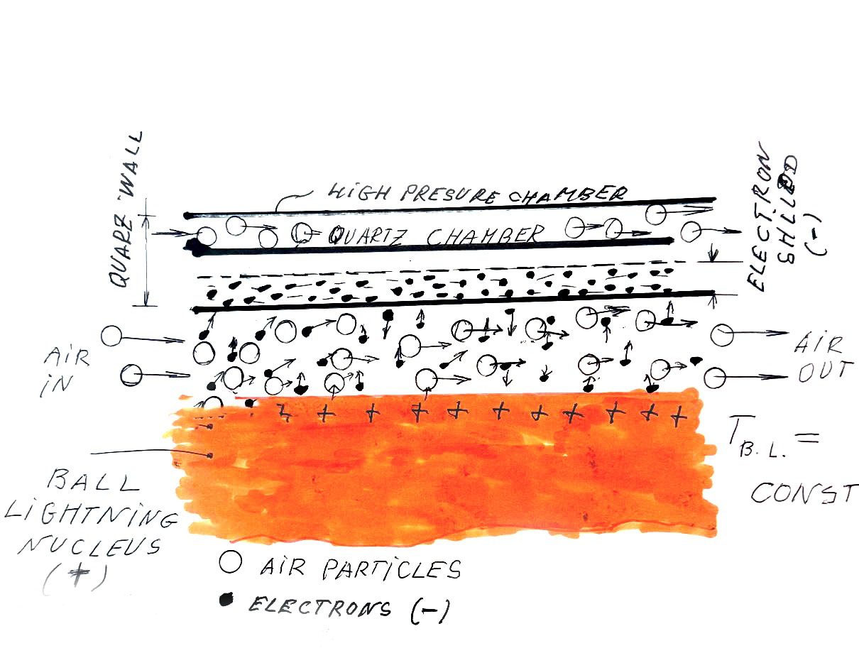 The source of energy for such an engine is ‘quantum free energy’ generated by powerful artificial ball lightning. My long four decade research convinced me that the best available frequency is 1-3 GHz, and the ball lightning created at high pressure medium of air. On the board of the airplane is installed a medium power GHz generator which is supplied by electricity from a diesel generator. The combined weight of the GHz generator, diesel generator, and tank of diesel fuel is many times smaller than the weight of fuel in conventional airplanes. The housing of the engine must be high pressure Chamber 1. Artificial ball lightning is created in a quartz chamber with 3-4 mm walls. Ball lightning exists continuously, non-stop. Although the melting point of quartz is 1,700 oC, and temperature at which quartz loses stability is 900 oC, the quartz chamber can support without destruction much higher temperatures than the temperature of ball lightning nucleus. In my Chinese high-pressure generator (for 8 atm pressure) quartz chambers have endured temperatures tens of thousands oC of the b.l. nucleus without any cracks or local melting. This strange phenomenon is due to the formation of a negative electron layer inside walls of quartz Chamber 2. Cooling air because of very high temperatures of b.l. The nucleus is ionized in proximity of b.l. nucleus, it consists mostly of electrons and positively charged ions. Electrons are light particles which cover big distances between two collisions, they are fast, easily penetrate quartz walls of b.l. chamber. Such a way electrons create a negatively charged protective layer in quartz walls See Figure 2.