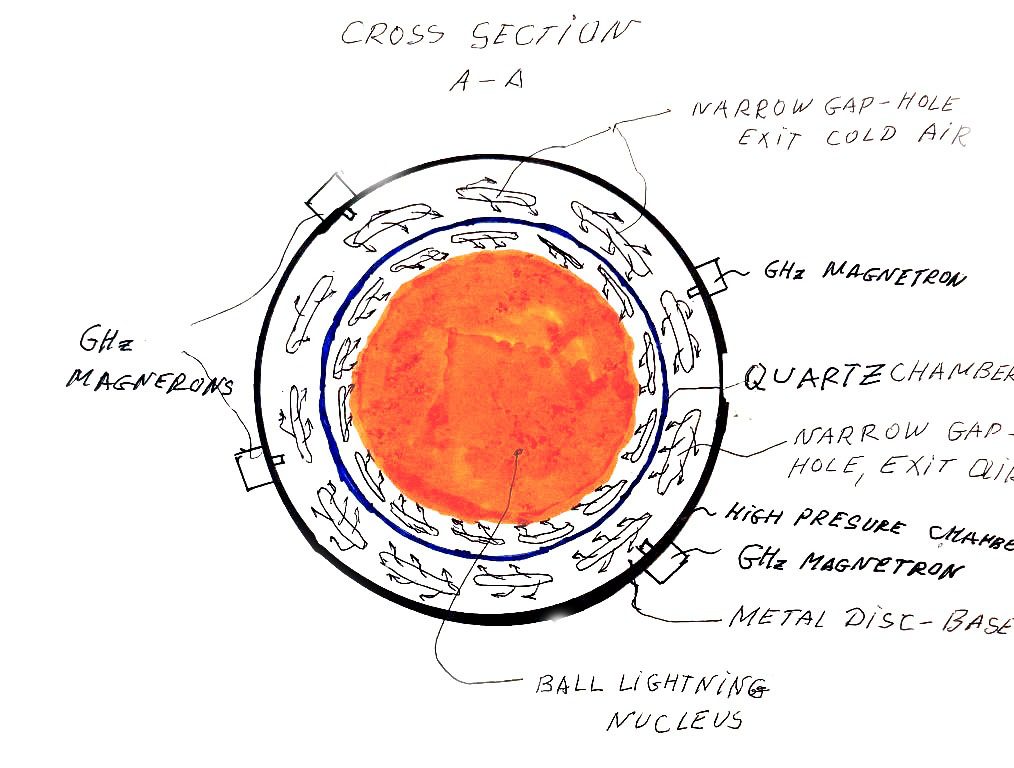 - Speed of the cooling air. My experiments proved that the gap between the ball lightning nucleus and the walls of the quartz chamber decreases considerably with increasing speed of cooling air. See figure 4. Smaller this gap is the bigger is density of air particles, bigger number of air particles take free energy from b.l. nucleus. Bigger is the yield of quantum free energy.